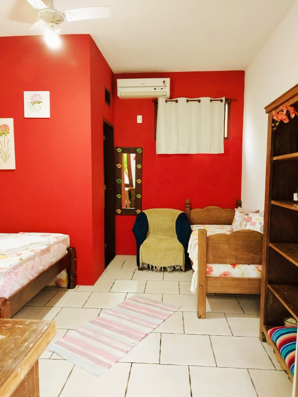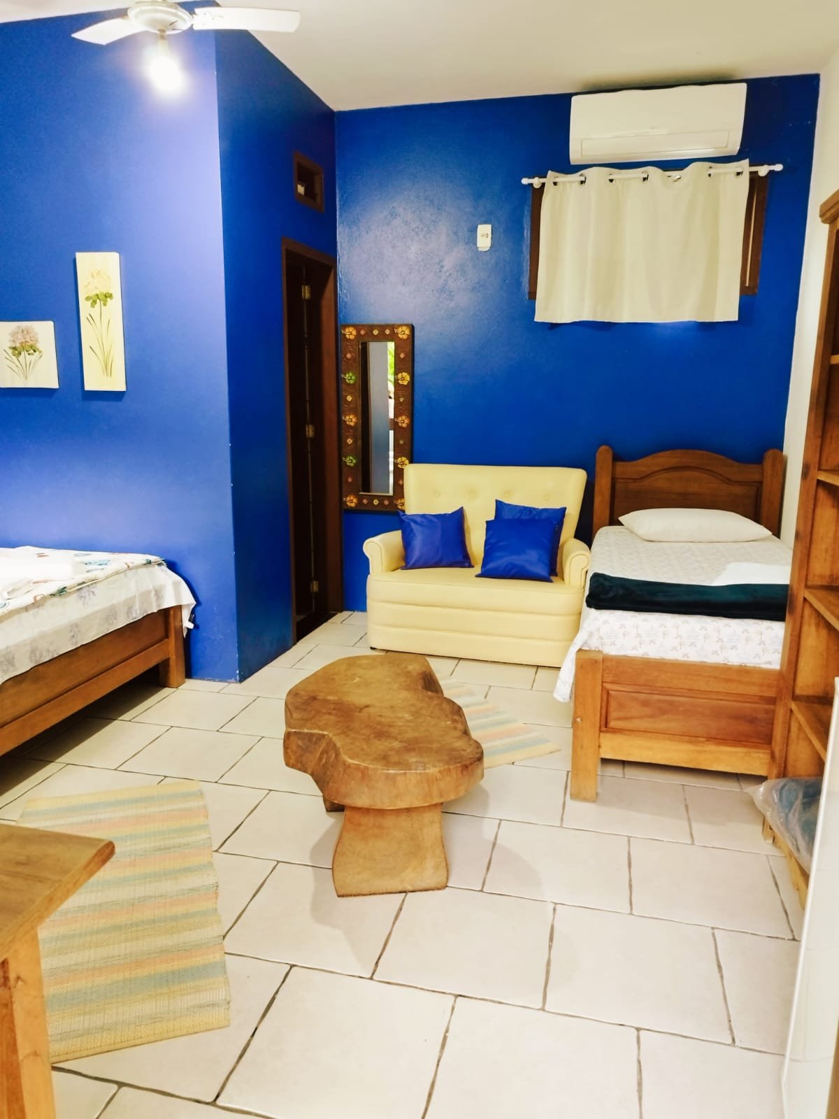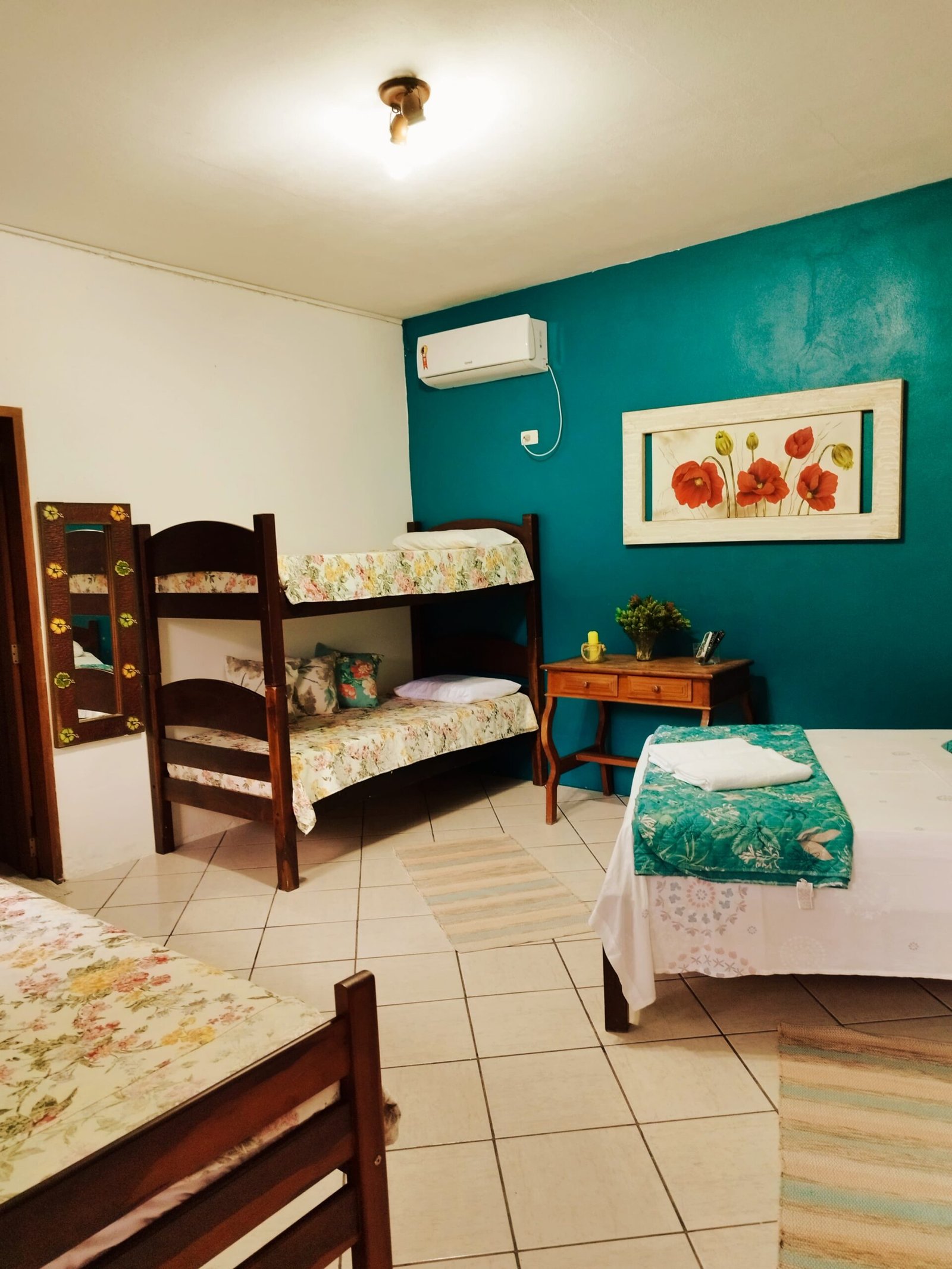 Conta com ar-condicionado, ventilador de teto, TV Smart, frigobar, banheiro privativo e Wi-Fi, garantindo conforto para todos.